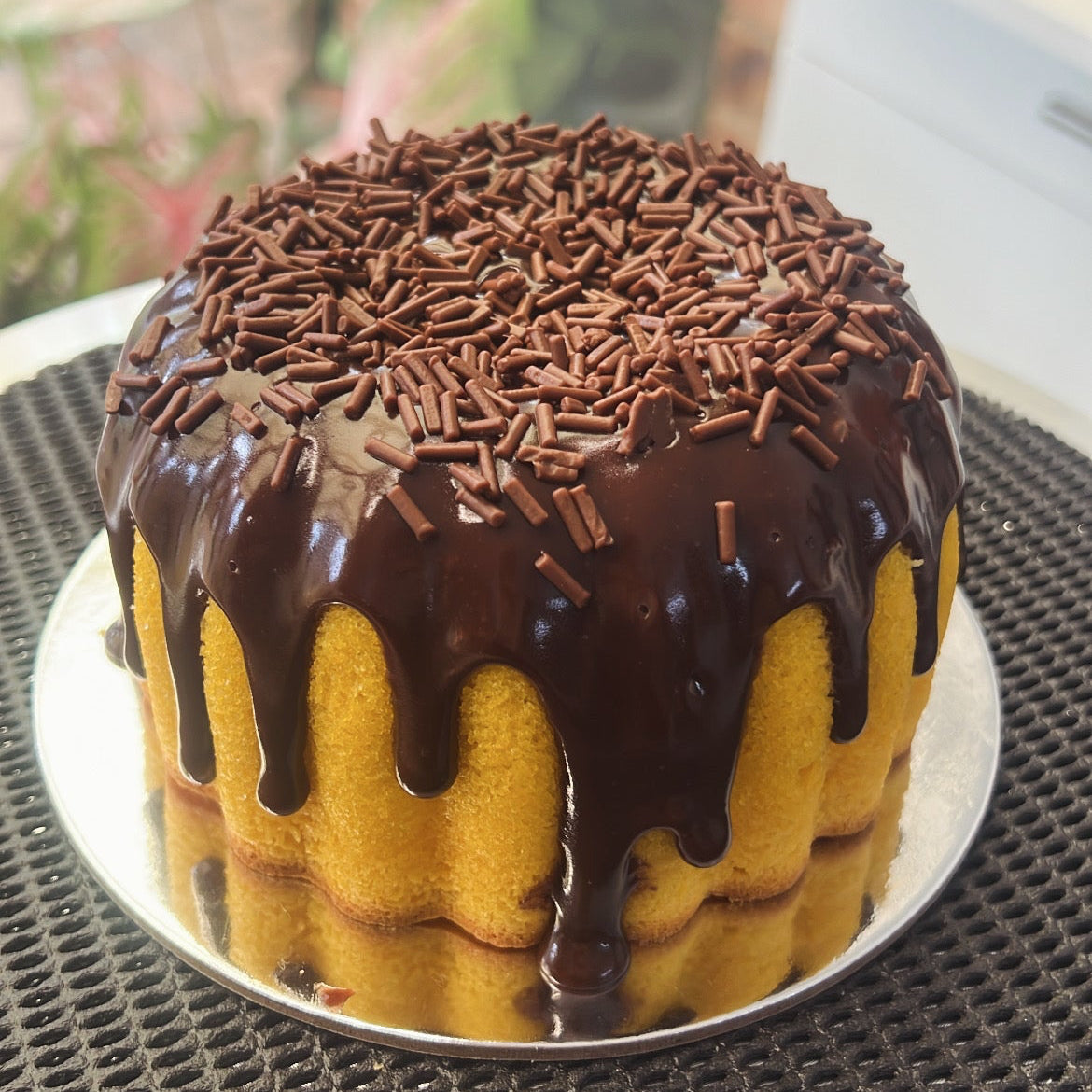 Vanilla cake with chocolate cream (brigadeiro). Smooth and nostalgic.