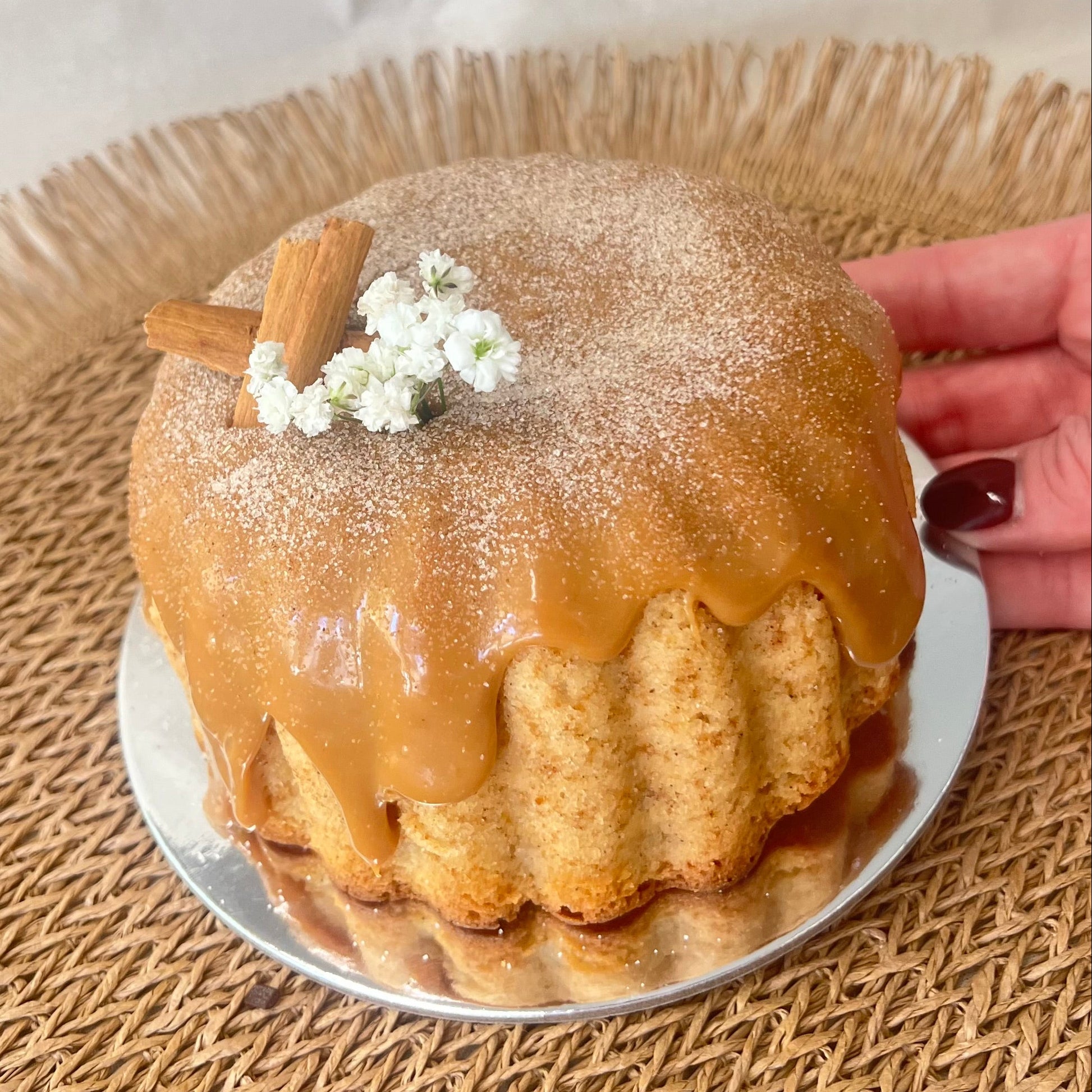 Cinnamon-spiced cake with creamy dulce de leche and a touch of cinnamon sugar.