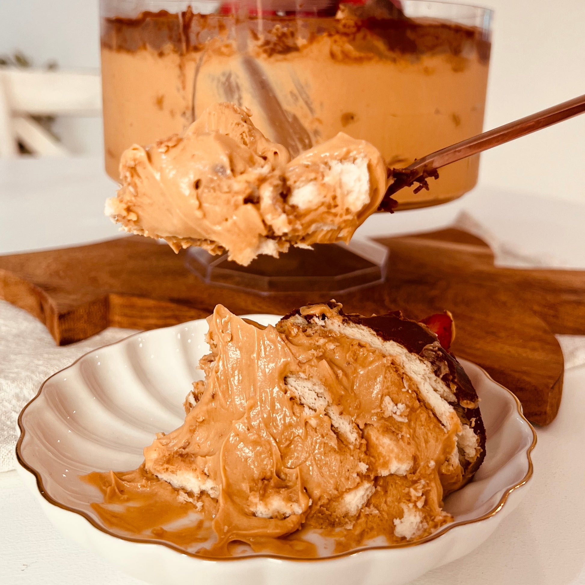 Traditional Dulce de Leche - A comforting classic with dulce de cream, soaked cookies, and a smooth dark Callebaut ganache finish.